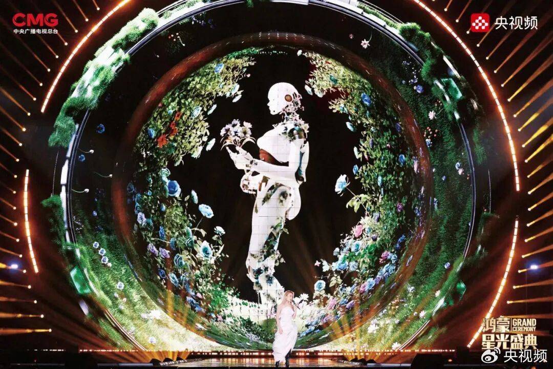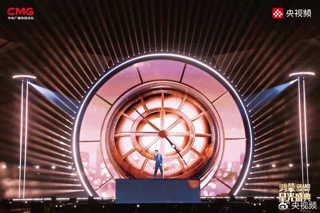 盛典以“鸿蒙初开,星河互联”为理念,打造出一座兼具东方哲学意蕴与未来科技感的舞台。象征“天”的曲面球体如星辰初开,寓意鸿蒙系统凝聚万物;象征“地”的水景舞台包容万象,两侧镜面副屏延伸出无限可能的数字世界。舞台本身也是技术的突破 —— 历经 8 天极限搭建,3065 块曲面屏无缝拼接,攻克结构与曲率的双重挑战;8 组灯光塔构筑起立体的“光宇宙”,书写万物互联的科技诗篇。在节目效果呈现上,盛典将 AR、AI 等前沿技术深度融合,打破物理与虚拟的界限,传递科技温度。