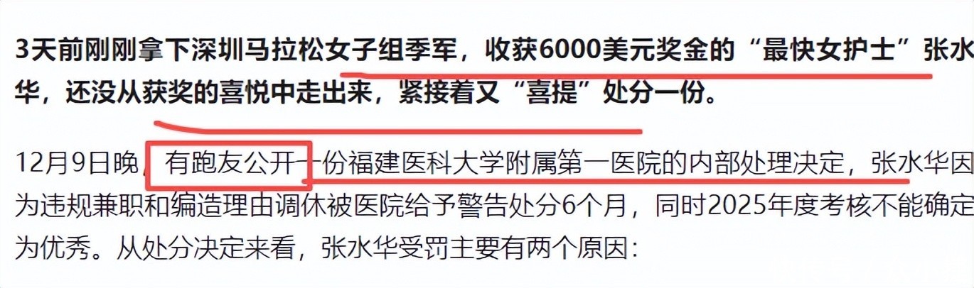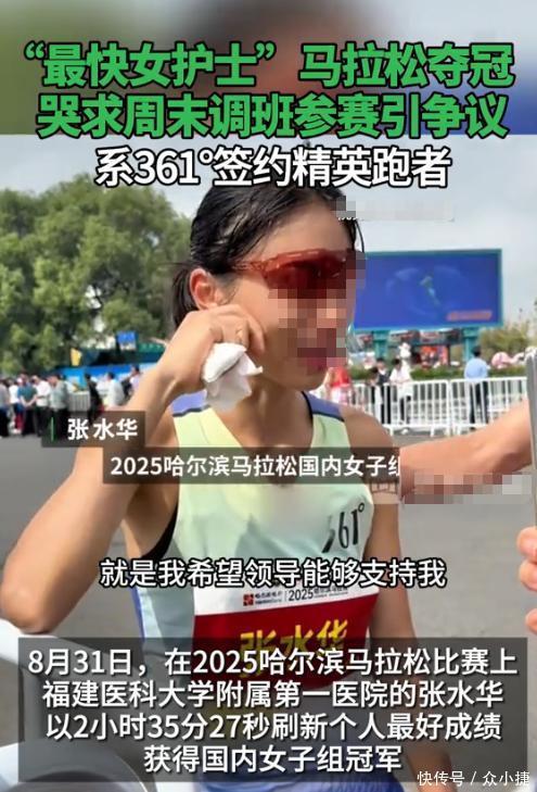 但张水华选择了隐瞒,直到2025年8月,她因在哈尔滨马拉松赛后哭诉调班难而引爆舆情,合作品牌迅速与她切割,医院才得以知晓此事。