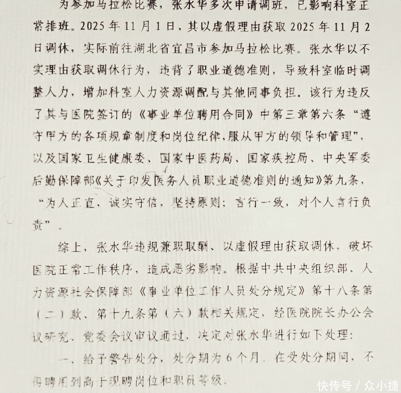 根据医院给出的原因是,“违规兼职取酬”和“以虚假理由获取调休”,最终张水华获得警告处分六个月,并取消其2025年度评优资格。