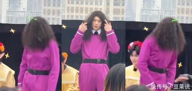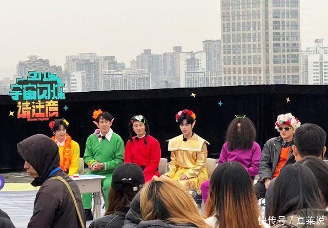 录制开启后,有网友就分享了相关的拍摄路透,节目组从造型就严格贯彻了放飞自我和抽象的原则。 穿着一身橙色,顶着花花头的黄子韬!一身黄衣,头上戴着大红花,COS葫芦娃的黄耀文!一身绿衣,同样戴着花朵的于洋!每个人的造型都充满了节目效果,让人看一眼就忍不住笑出声! 但是当看到一身紫色衣服,顶着爆炸头,连脸都看不到的王鹤棣登场时,才知道《宇宙闪烁请注意》这个节目玩的有多疯,同时也再度被王鹤棣这豁出去的表现所惊讶到,让人忍不住直呼:王鹤棣在内娱真是没有在乎的人了,能顶着这造型录制综艺的,我想也就他了吧! 我们可以看到,相比起黄子韬、刘耀文啥的只是穿搭和色彩有些戏谑,总归还能让人认出来。王鹤棣这一身紫色,绿色发箍下夸张的爆炸头,要是没有手动拨开头发的话,活脱脱的就是一行走的“紫茄子”!