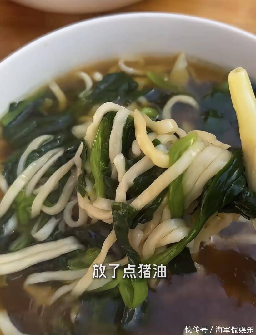 劳动完,一身泥巴的朱丹回到家,等待她的是一碗母亲刚做好的手擀面。 面条的卖相很普通,宽细不一,但里面放了自家熬的猪油,还加了刚从地里摘回来的青菜。 朱丹端着碗,吃得很香,她说这菜是“还没断气”的那种新鲜,面特别筋道,猪油的香味一下子就把人抓住了。